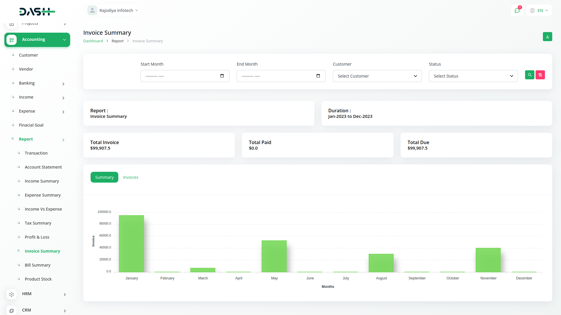 Obter um relatório sobre transações com uma opção de filtragem fácil. Faça o download das instruções de conta necessárias em formato PDF, CSV ou Excel. Você recebe relatórios devidamente preparados sobre Rendimento Individual, Despesas, Imposto, Fatura e resumo de contas. Filtre-os com base em Conta, categoria e clientes. Também, uma exibição gráfica do gráfico de Custas do VS de Renda juntamente com um cálculo detalhado do Lucro E Perda irá ajudá-lo a tomar decisões informadas. Filtrar o gráfico de resumo de impostos e Renda VS Despesa com base em anos financeiros.