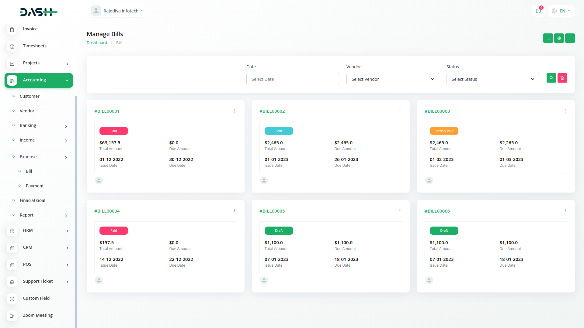 Conta é um software de gestão de contas que facilita a facilidade no cálculo da receita, mantendo uma aba em todos os assuntos de contabilidade dos negócios. Baseado em Laravel, este software de contabilidade tornará suas operações comerciais lisas e convenientes. Uma representação gráfica e tabular de vários elementos irá ajudá-lo a tomar decisões informadas para a sua firma.