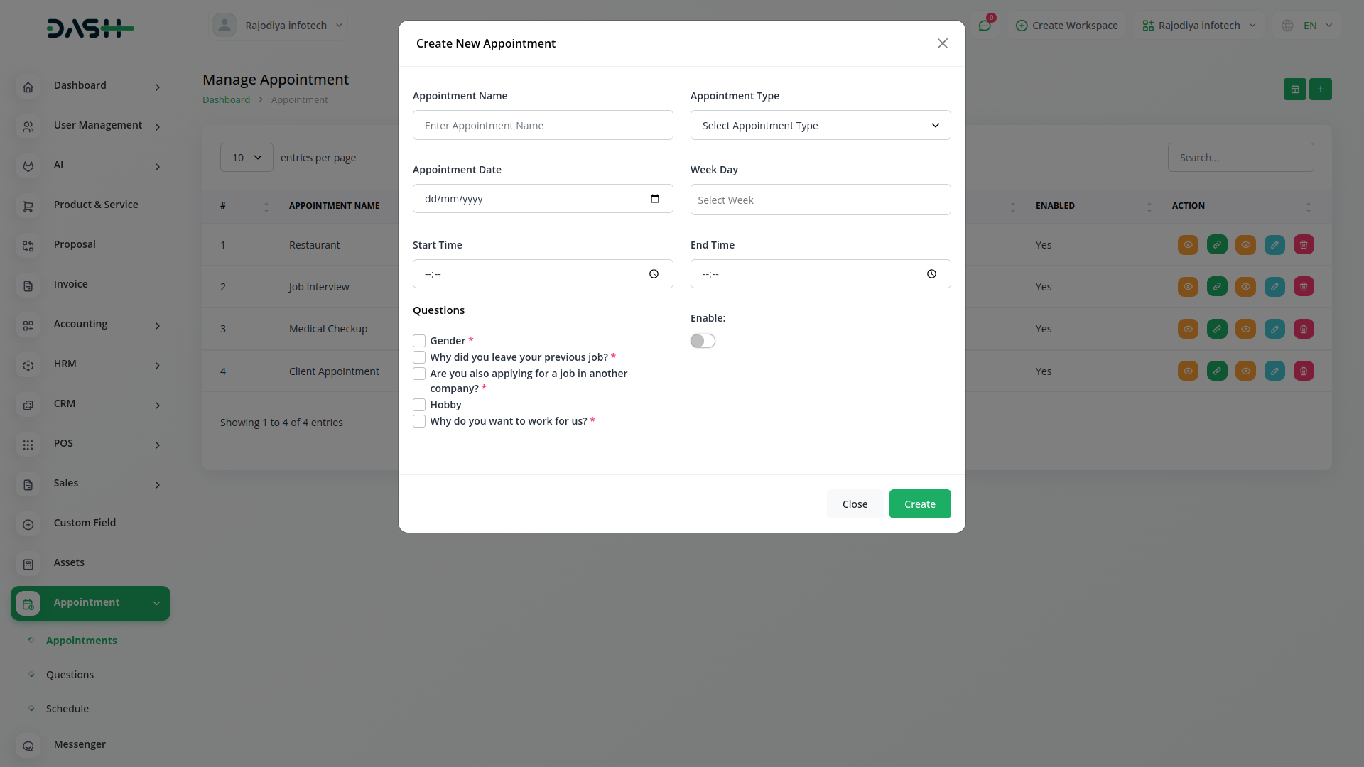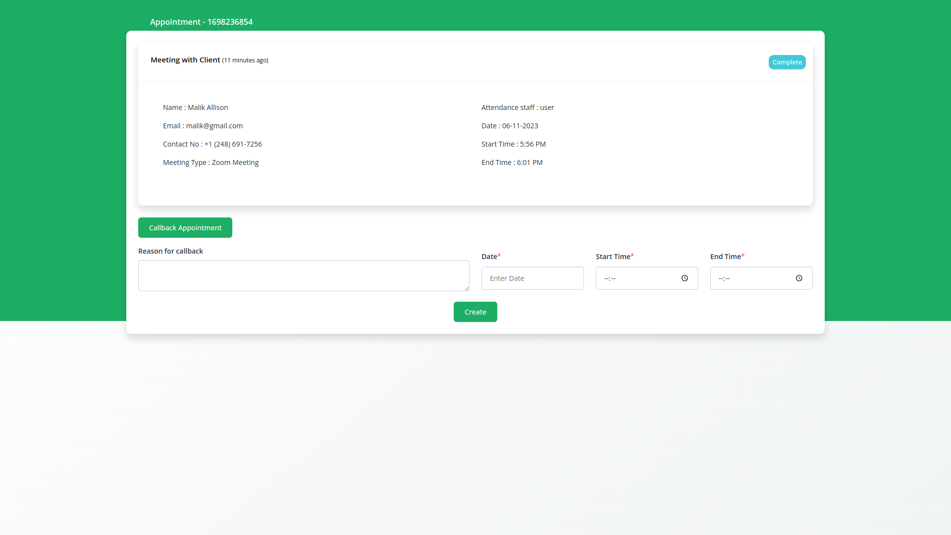 Na seção de nomeação, você pode criar um compromisso. Ele tem um botão de calendário que exibe todos os compromissos e muda de cor de acordo com o status de compromisso. Ele possui um botão de link de cópia, no qual qualquer usuário pode preencher o formulário de compromisso.