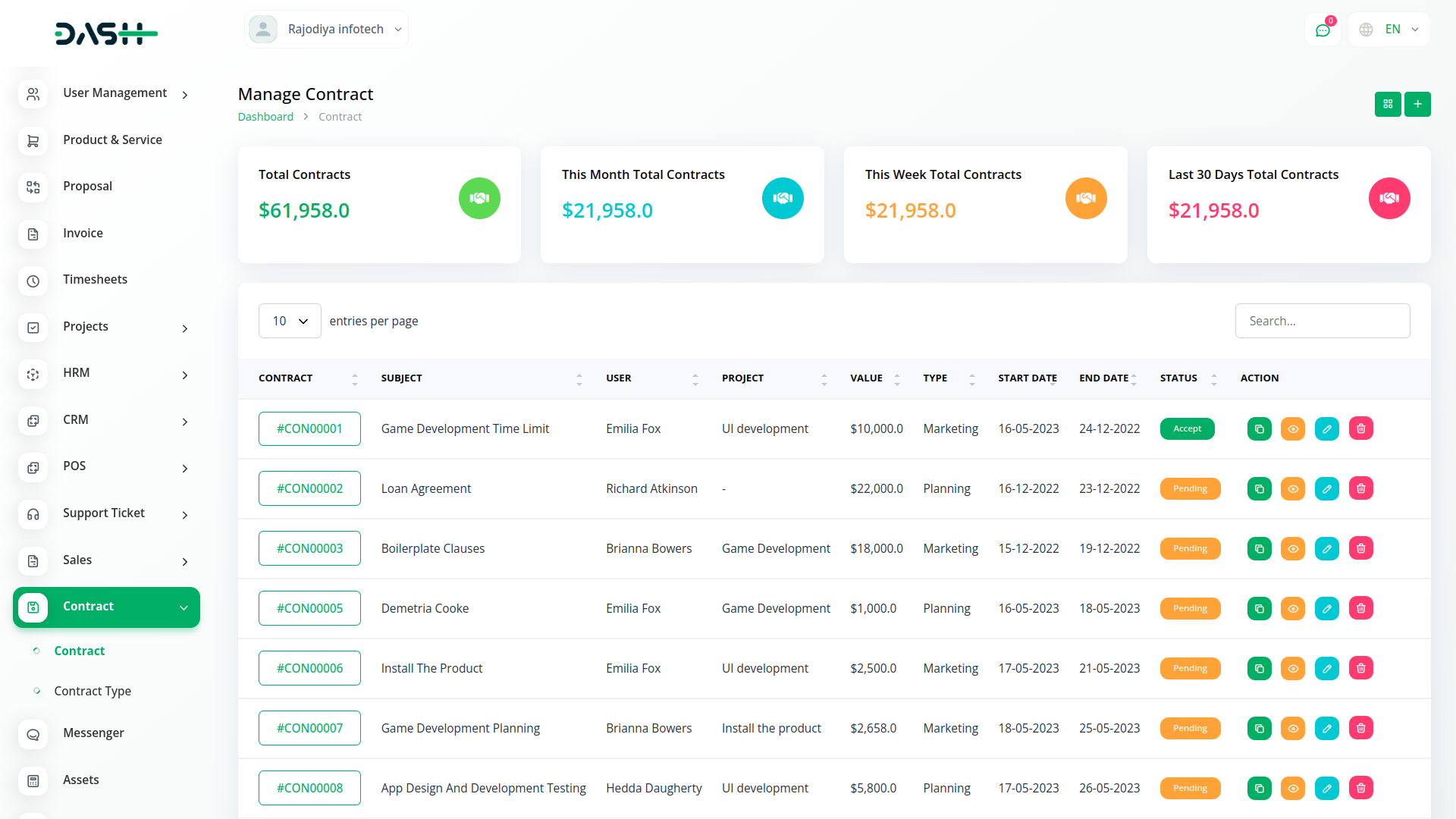 O Módulo de Contrato é muito útil para a documentação adequada dos contratos feitos com os clientes que mostram o tipo de contrato, o valor e a duração do tempo. As configurações predefinidas podem ser feitas / atualizadas através do Setup.