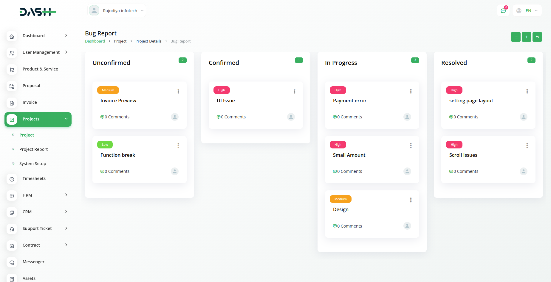 Crie novos bugs e atribua usuários e prioridades a eles. Você pode escrever uma nota na caixa de texto para a descrição do bug. Além disso, o status de cada bug pode ser alterado por meio de um sistema de arrastar simples e Kanban.