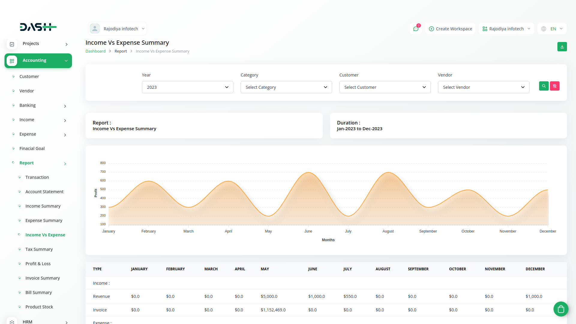 Obter um relatório sobre transações com uma opção de filtragem fácil. Faça o download das instruções de conta necessárias em formato PDF, CSV ou Excel. Você recebe relatórios devidamente preparados sobre Rendimento Individual, Despesas, Imposto, Fatura e resumo de contas. Filtre-os com base em Conta, categoria e clientes. Também, uma exibição gráfica do gráfico de Custas do VS de Renda juntamente com um cálculo detalhado do Lucro E Perda irá ajudá-lo a tomar decisões informadas. Filtrar o gráfico de resumo de impostos e Renda VS Despesa com base em anos financeiros.