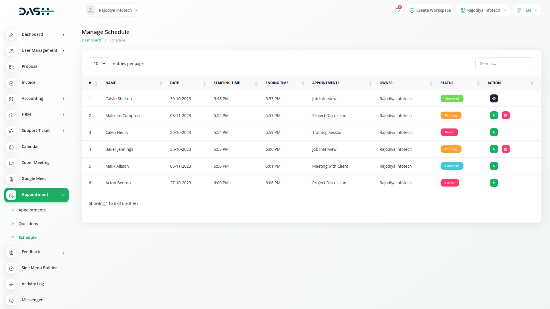 Na seção de nomeação, você pode criar um compromisso. Ele tem um botão de calendário que exibe todos os compromissos e muda de cor de acordo com o status de compromisso. Ele possui um botão de link de cópia, no qual qualquer usuário pode preencher o formulário de compromisso.