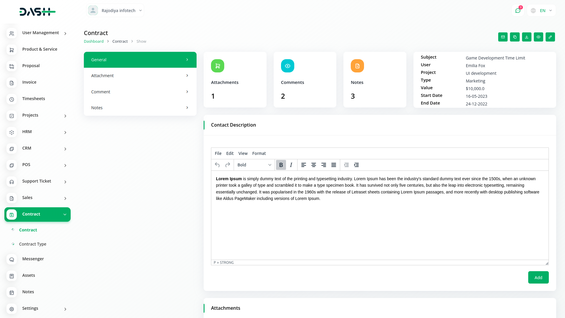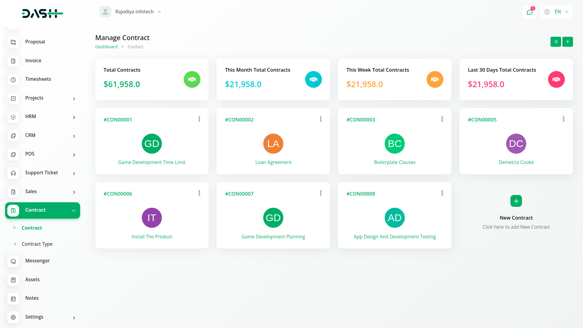 O Módulo de Contrato é muito útil para a documentação adequada dos contratos feitos com os clientes que mostram o tipo de contrato, o valor e a duração do tempo. As configurações predefinidas podem ser feitas / atualizadas através do Setup.