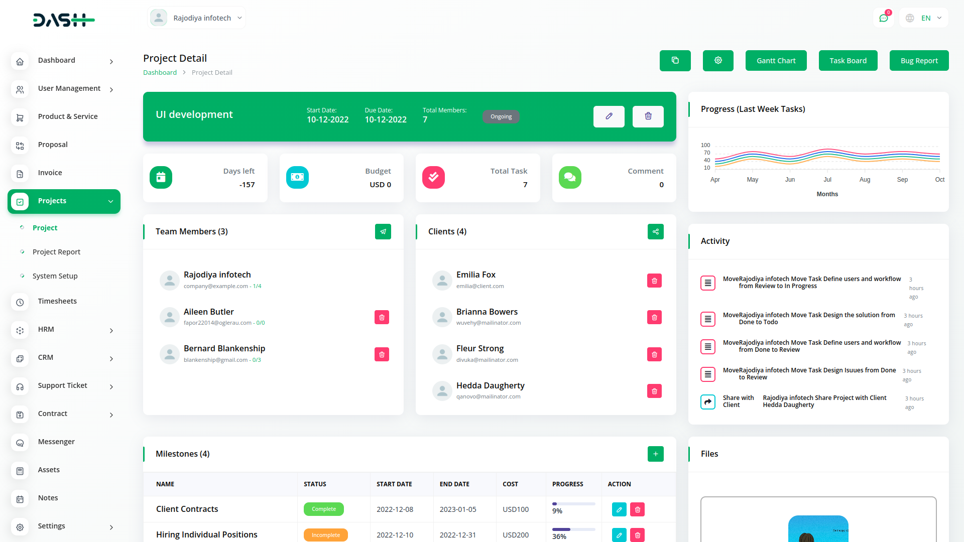 Anexar custo e resumo aos marcos e alterar o status através do menu suspenso. Obter uma guia sobre atividades recentes de um projeto e também um gráfico sobre o progresso. Junto com isso, você pode conferir os detalhes de suas tarefas em detalhes do projeto com a ajuda do Gráfico de Gantt.