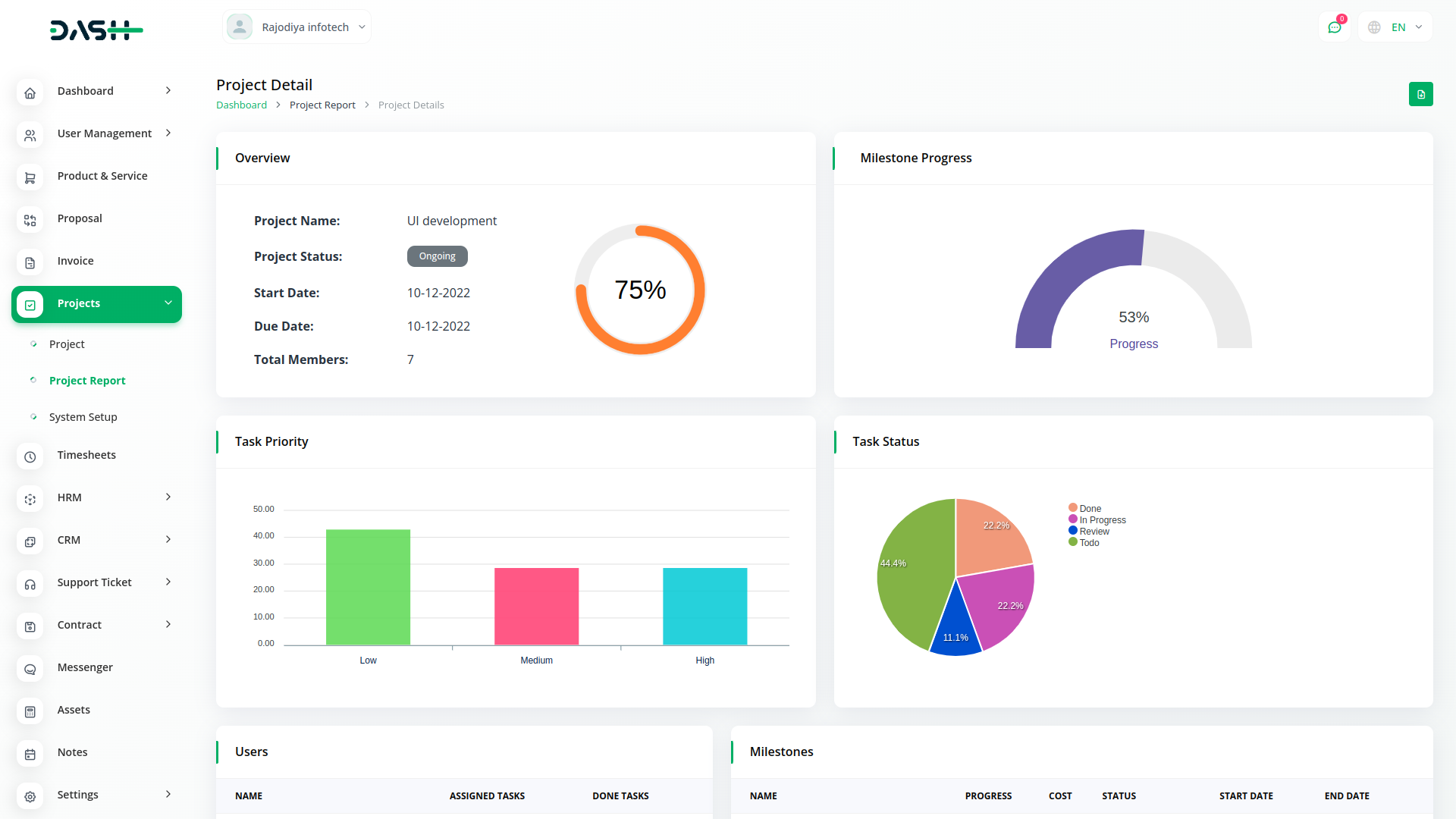 Um projeto pode atribuir sua tarefa e bug a sua equipe. Uma visão geral da tarefa e a representação visual do status do projeto podem ajudá-lo a estimar o progresso em cada tarefa. Por fim, você pode verificar a função fixa superior.