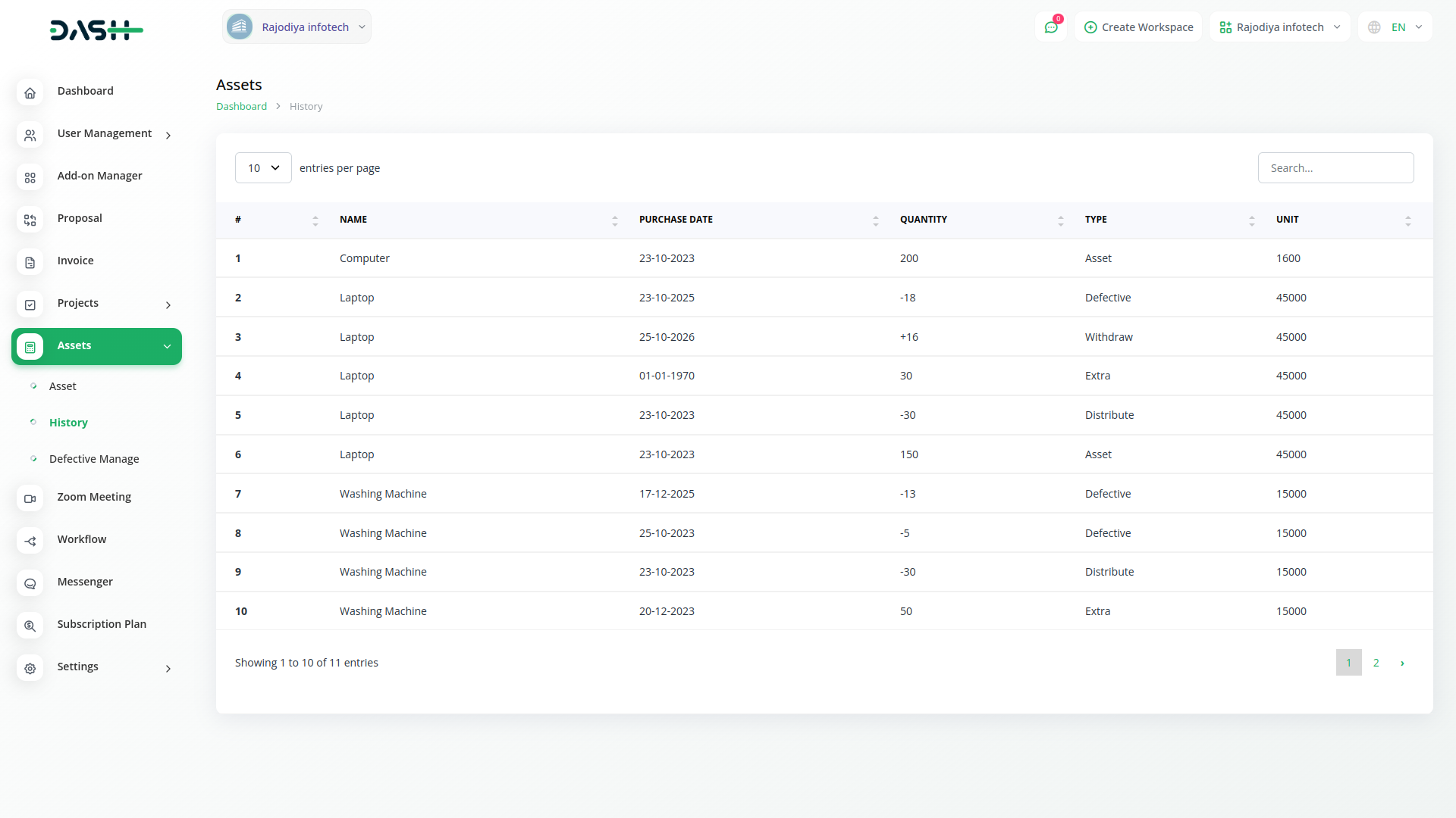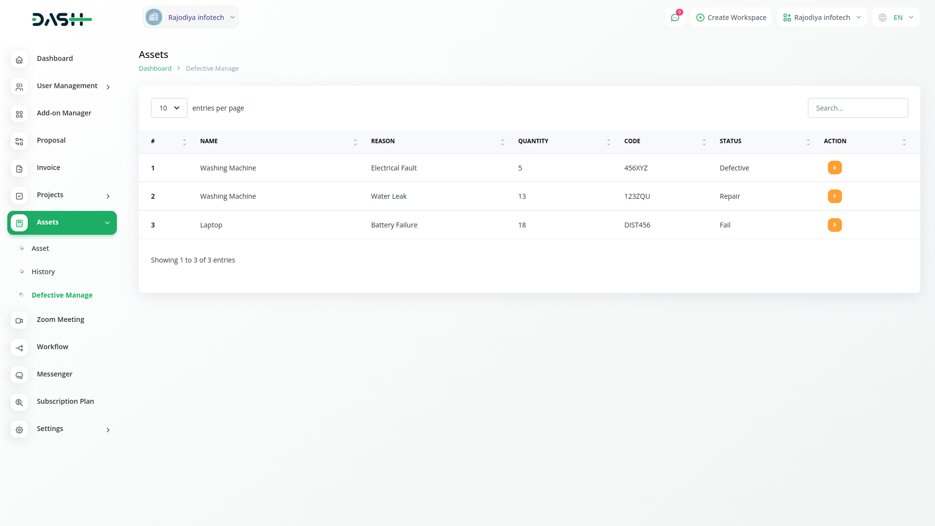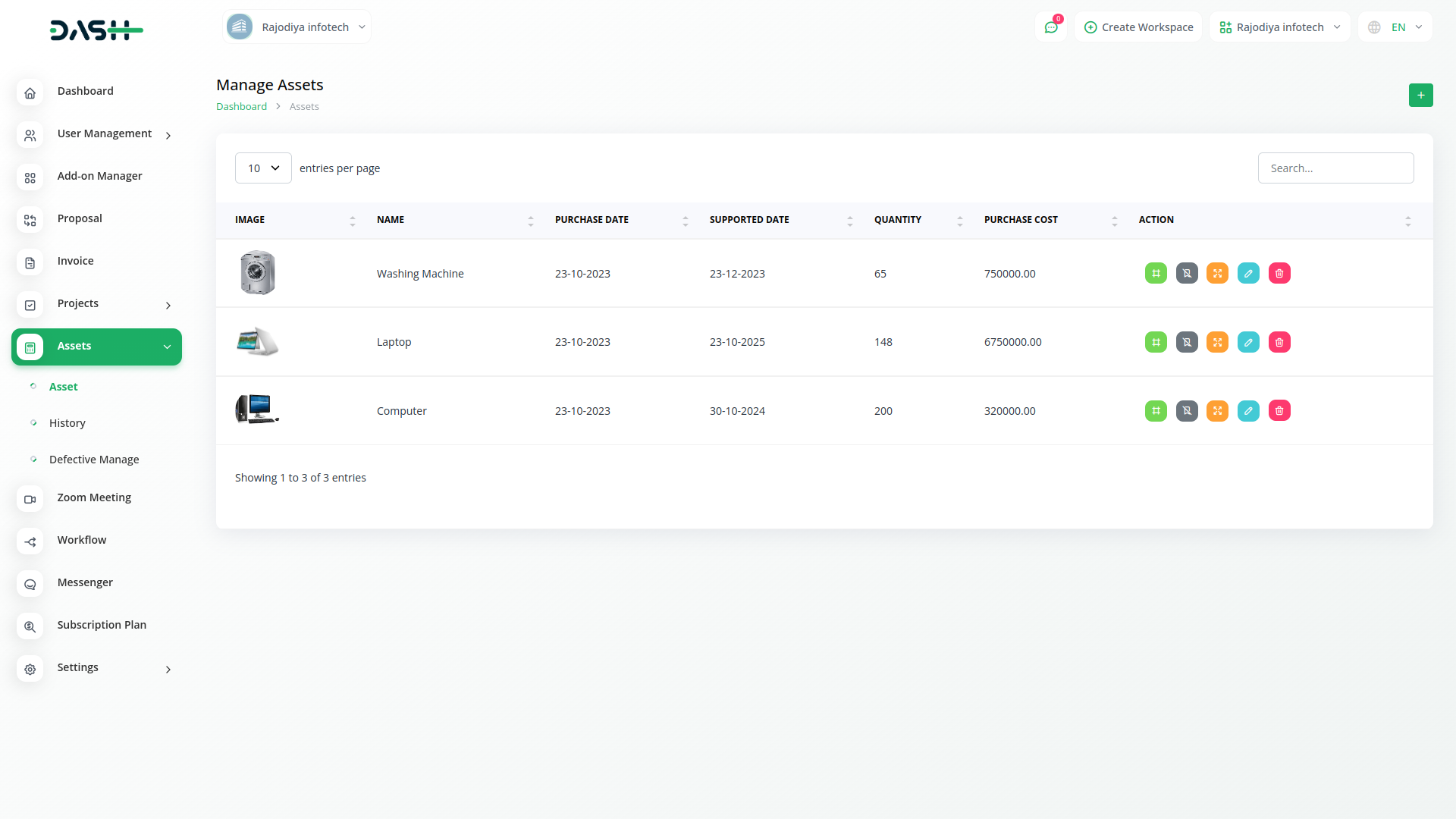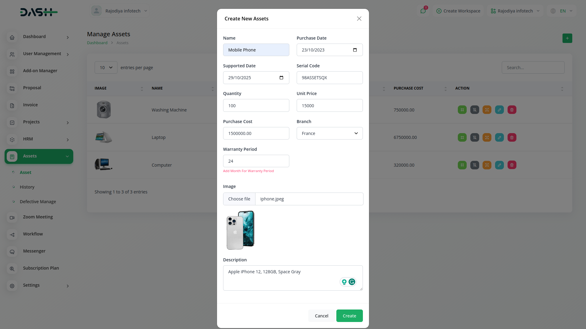 Em nosso módulo de ativos, implementamos um sistema robusto para a gestão de ativos simplificados. Ele inclui detalhes vitais do ativo: "Nome," "Código de Série," Preço "," Quantidades "e" Data de Compra ". Este sistema garante o rastreamento preciso do inventário e a responsabilidade financeira, aprimorando a eficácia operacional.